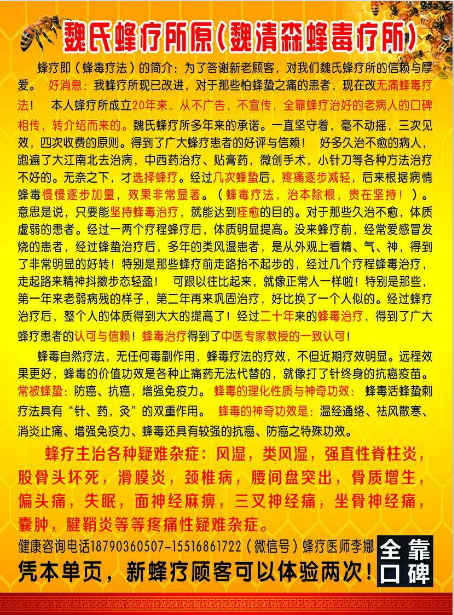 魏清森蜂疗所,绿色自然蜂毒疗法,与中医针灸穴位相结合。愿意为广大患者一直治疗服务下去,组建和谐家庭,共同回报社会,为祖国医疗事业做出应有的贡献!